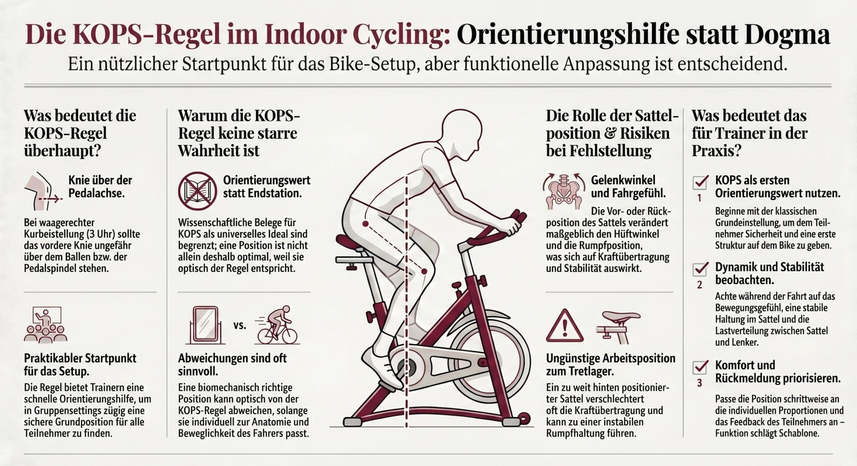 Viele Trainer arbeiten im Kursalltag mit diesem Orientierungswert. Das ist verständlich, denn die Regel ist leicht vermittelbar und schnell umsetzbar. Gleichzeitig lohnt sich ein genauerer Blick. Denn die KOPS-Regel ist keine unumstößliche biomechanische Gesetzmäßigkeit, sondern eher ein praktikabler Startpunkt für die Sattelposition im Indoor Cycling.